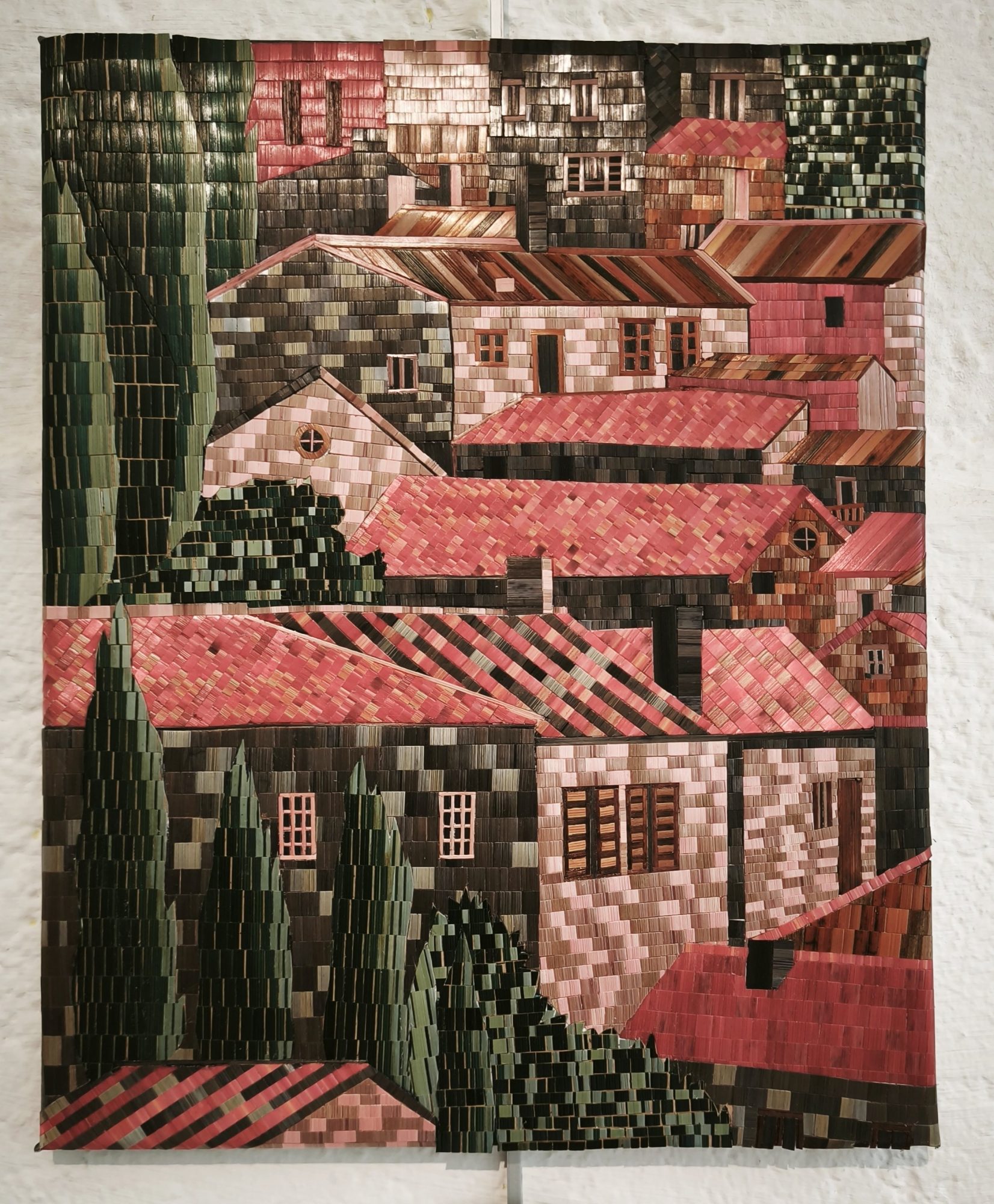 Livraison gratuite à partir de 99€ d'achatTableau réalisé sur toile représentant des maisons et cyprès façon mosaïque.